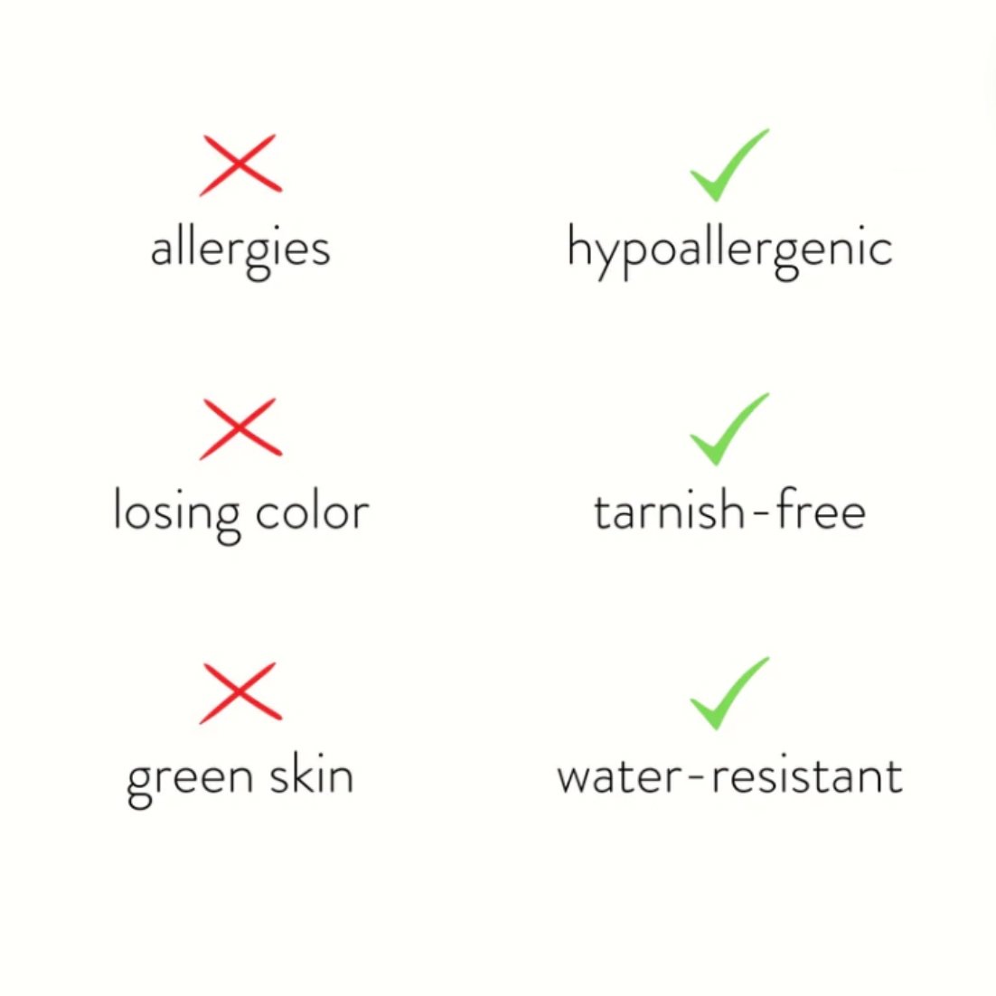 Cada pieza es impermeable, resistente al sudor, hipoalergénica y libre de deslustre, por lo que no tendrás que preocuparte por quitártela.